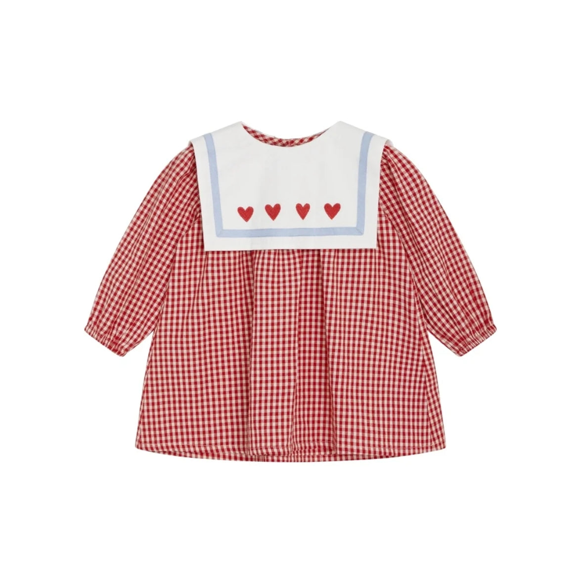 Design Details: Classic gingham pattern, heart-embroidered collar, and split puff sleeves.