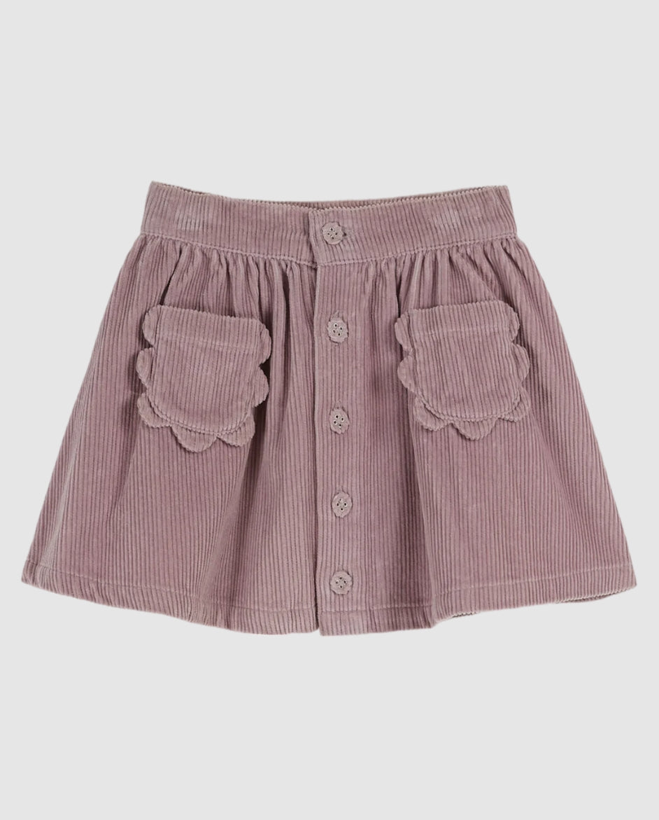 Purple cotton velvet mini skirt. A pretty mini skirt in thick, soft, ribbed cotton velvet. It's mounted on a waistband into which a buttoned elastic band slides to adjust to all sizes. The two gathered front panels close with fabric-covered buttons and each houses a delightful flower patch pocket for keeping hands warm or hiding little treasures.