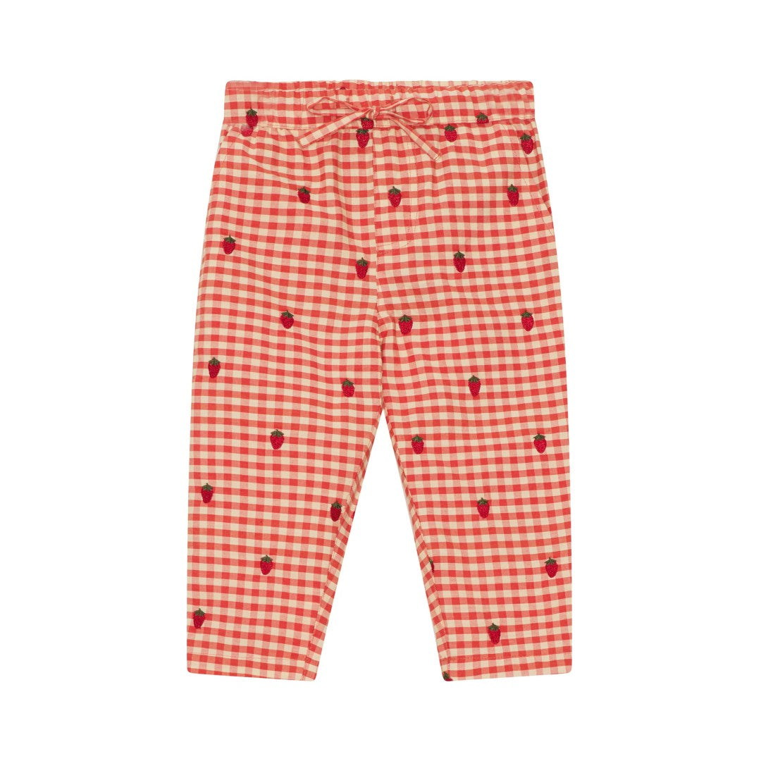 Grundpreis proThe Molly Pants feature a delightful gingham pattern with all-over strawberry embroidery, adding a charming touch to your everyday wardrobe. Crafted from 100% cotton, these lightweight pants offer both style and comfort. With an elastic waistband and adjustable drawstrings, the Molly Pants ensure a perfect fit for any occasion. Their relaxed fit makes them perfect for casual days, whether you're lounging at home or out and about. Pair them with your favorite top for an effortlessly chic look.