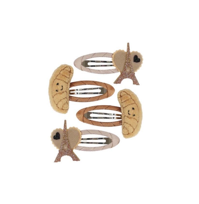 The set consists of 4 beautiful pins covered with a velvet fabric. This gives them a chic look. 2 of the 4 pins feature a cute croissant with a face. The other two pins feature a heart and the Eiffel Tower. Super fun!
