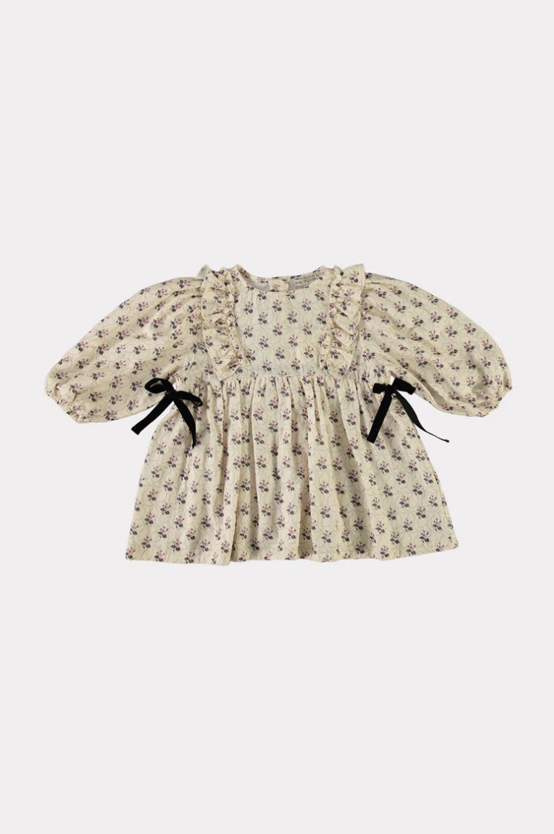New silhouette in AW24 season Colette. Adorable Colette blouse in signature flower print of the season. Crafted from softest organic cotton muslin. Comfortable loose fit blouse features darling ruffled chest detailing, velvet bows on the sides and puff sleeves. Closes with mother of pearl buttons in the back. We love to match with Claude pants for an effortlessly charming look.