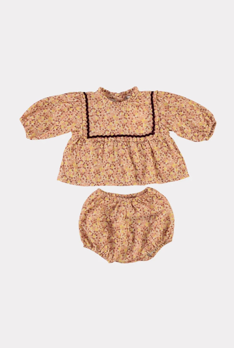 Inspired by vintage childhood memories our beloved Gabriella set is crafted from softest cotton muslin in fall garden print and trimmed with burgundy velvet tape. Gentle ruffled detailing at the chest and collar with balloon puff sleeves. Set comes with adorable balloon bloomer. Perfect match with Gabriella bonnet.