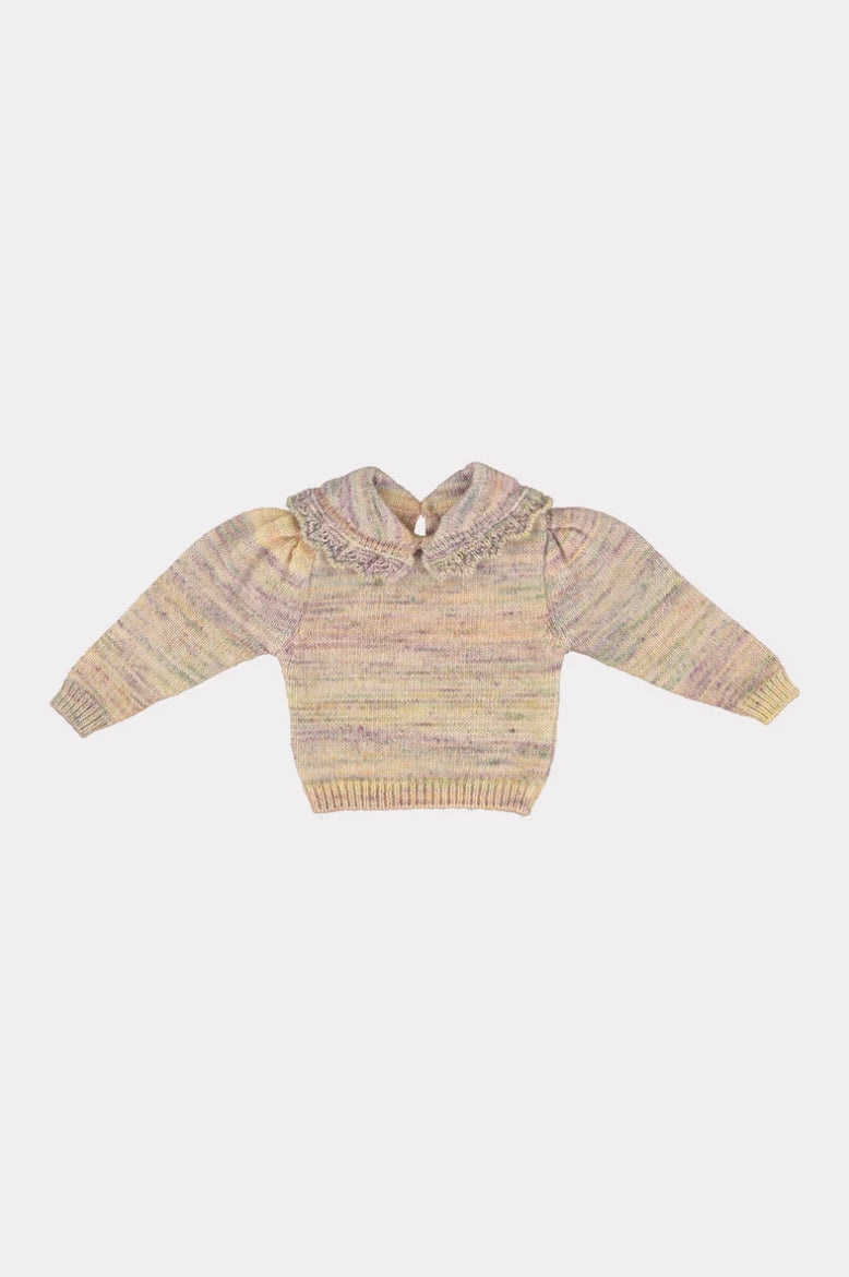 Bebe Organic classic baby jumper in softest baby alpaca blend yarn in most adorable muted fall colours of green, yellow and purple dyed yarn. Crafted to be gentle on the most sensitive skin. Adorable lightweight jumper features signature collar with lace detailing, puff sleeves with ribbed cuffs and back opening with button. Perfect match with Sienna bonnet and leggings.