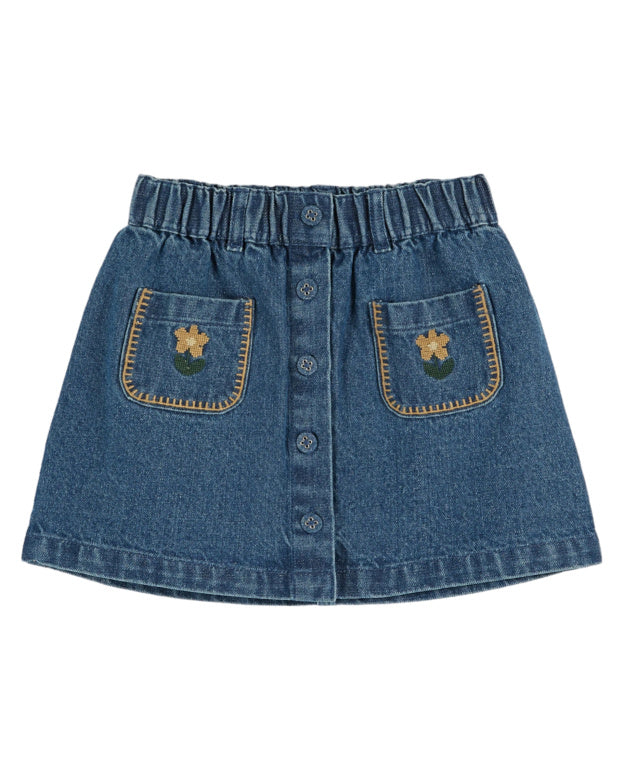 Precio unitario porMini skirt in blue denim cotton canvas. A pretty mini skirt featuring a back yoke and four panels mounted on an elasticated waistband to fit all sizes. The two front panels close with fabric-covered buttons, and each features a delightful patch pocket embellished with embroidery all around. In the center, an ochre-yellow cross-stitched heart flower. The back panels each feature a patch pocket with topstitching.