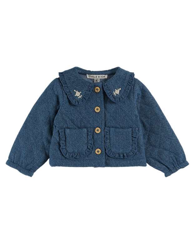 Precio unitario porQuilted jacket in blue denim cotton canvas. Straight cut, set-in sleeves with elasticated cuffs, hand-embroidered flowers on the flat collar enhanced by a gathered frill around the crew neckline and wooden buttons closing the entire height of the jacket. Two pockets with gathered ruffles around the edges are plated on the front. You can hide candy, a handkerchief or even sweet notes in them. Oblique stitching joins the blue cotton voile lining, fleece and denim. An autumn jacket that will also do well in spring with a skirt, dress or pants.