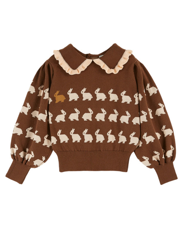 Jacquard sweater in cocoa organic cotton. The fancy stitch in which it's knitted is a change from the graphic of stockinette stitch, and the jacquard technique adds thickness to the piece. A sweater with a wise crew neck surrounded by a collar edged with a pink frill that extends over the shoulders, wide sleeves, tone-on-tone 1X1 ribbing at the hem and cuffs, in which elastic threads are woven to prevent the ribbing from slackening over time. In the back, a button placket and wooden buttons allow the head to be slipped over, leaving the ears firmly in place. The pink rabbits, among whom an intruder has slipped in, are ready to take whoever follows them to wonderland.