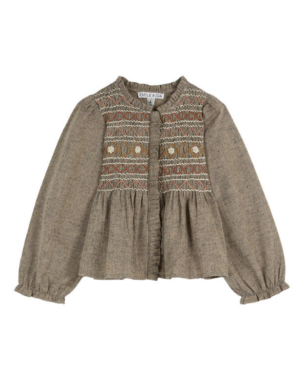Precio unitario porLong-sleeved blouse in mottled brown cotton and Flex. Smocks embroidered with flowers at the front and a flat back to the halfway point of the blouse. Then the gathers generated by the smocks and those supported by the cut-out back give the fullness and ease needed for little girls' movements, from the most well-behaved to the most rambunctious. The round neckline is topped by a ruffled band, the same that runs the length of the button placket and conceals it. The long sleeves are tightened at the wrists with an elastic band for a ruffled effect. A blouse that loves to show off, but doesn't wait to go out.