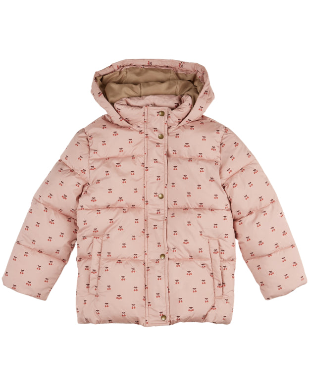 This polyester down jacket is making its second comeback at Emile & Ida. Pink down jacket dotted with bunches of red cherries. Straight cut, long sleeves tightened by elastic at wrists, raglan pockets, metal zipper hidden under a snap button placket, hood to keep your thoughts warm in all circumstances. An elegant down jacket that will keep even the fussiest of little girls warm and out of the rain up to the knees, thanks to its inner fleece and faux fur lining.
