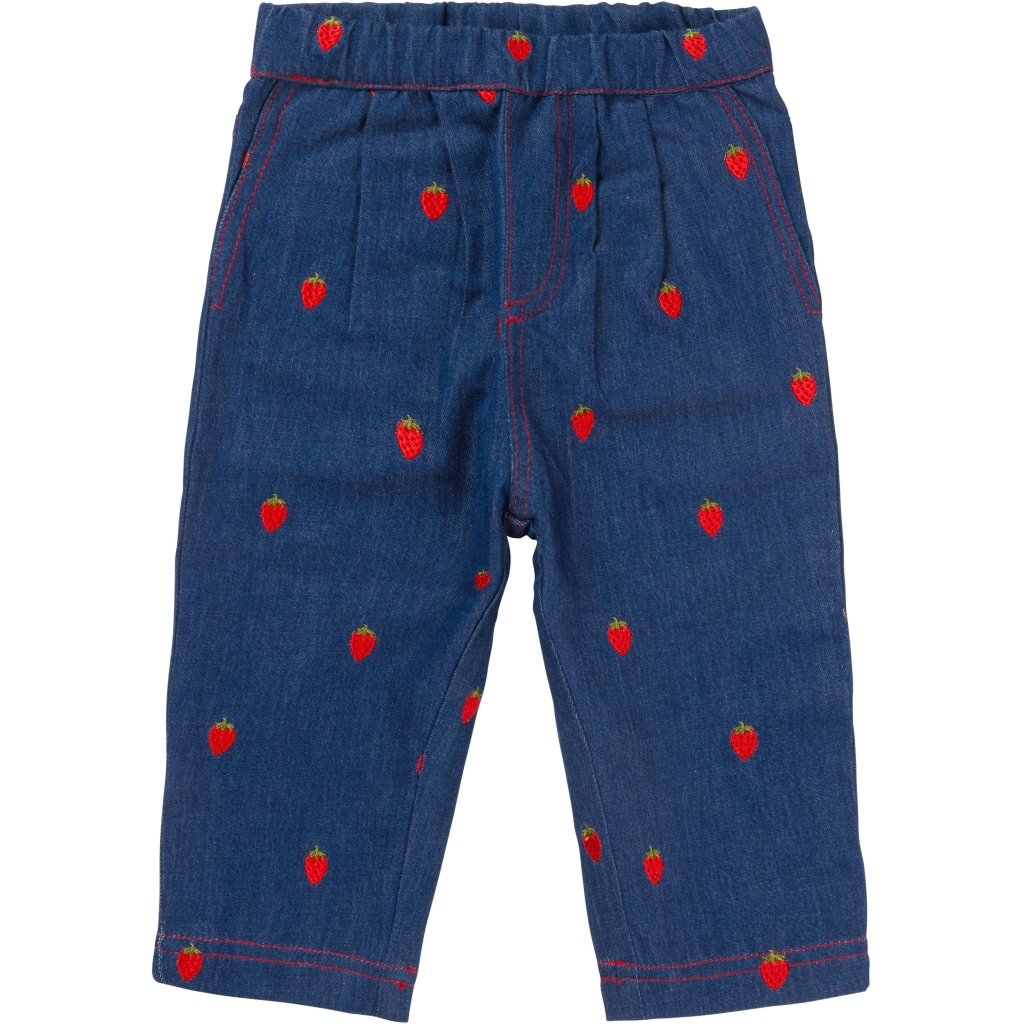 Precio unitario porThe Colette Pants are crafted from 100% cotton, featuring a playful all-over strawberry embroidery that adds a charming touch to your wardrobe. These pants are designed for comfort with a loose fit, dropped crotch, and an elastic waistband for easy wear. With side and back pockets, as well as a stylish faux fly, the Colette pants are perfect for casual outings or relaxed home wear. The light woven denim makes them breathable and ideal for year-round wear.