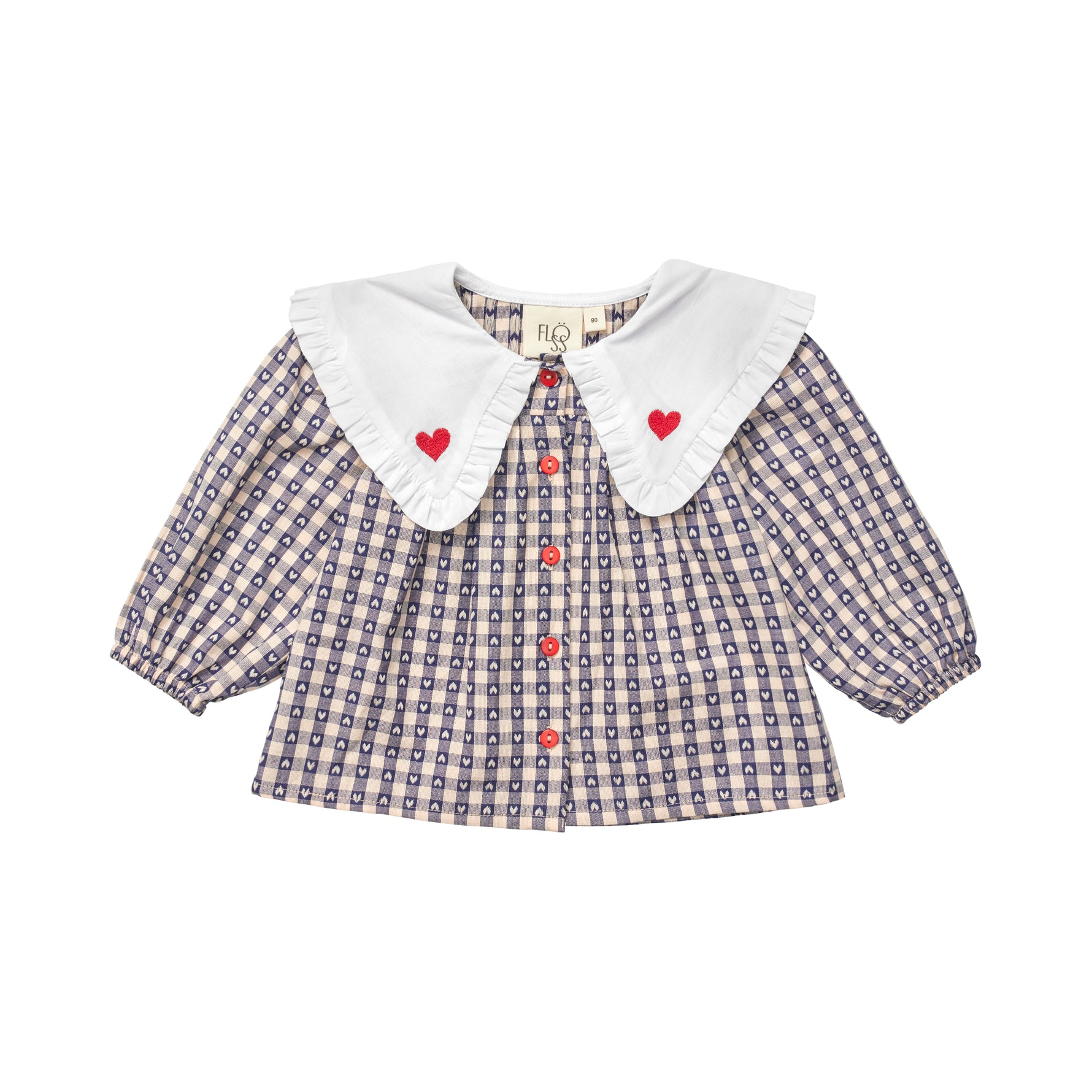 The Girls' Indigo Heart Blouse features an indigo heart print and standout red buttons for a unique touch.