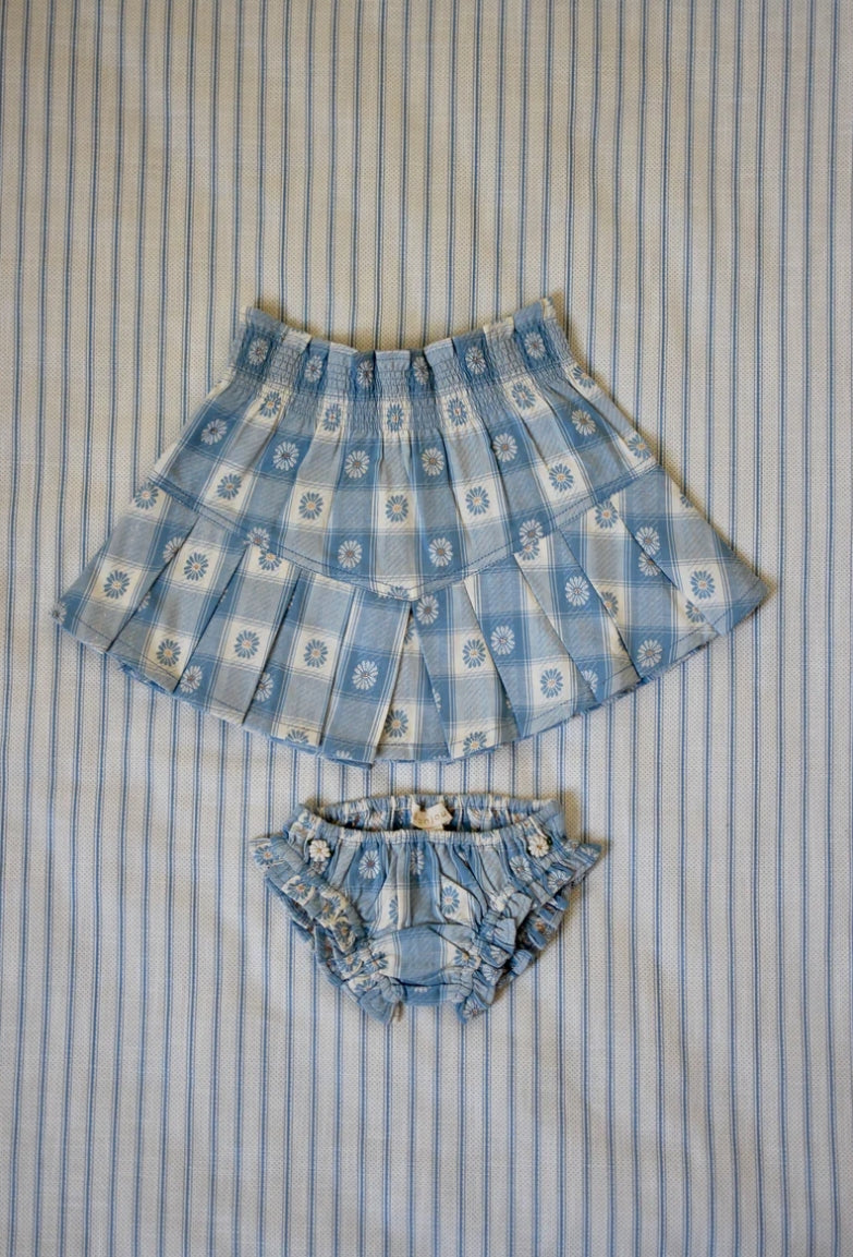 Precio unitario porThe Bonjour Baby Skirt and Bloomer Set is a charming and versatile outfit, crafted from soft, breathable fabric. Featuring a blue plaid pattern with delicate floral accents, this set is perfect for warm days or can be layered for cooler weather. The skirt’s elastic waistband and the ruffled bloomers combine classic style with comfort.