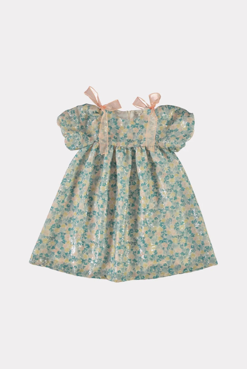 Forever inspired by romantic dreamworld. Every girls favourite ceremony dress for this fall special occasions. Maya dress is made with attention to details - featuring moon floral print sequins, adorable organza ties on shoulders, ruffled chest, and voluminous short sleeves with gathering detailing. Truly beyond beautiful dress for this fall season celebrations!