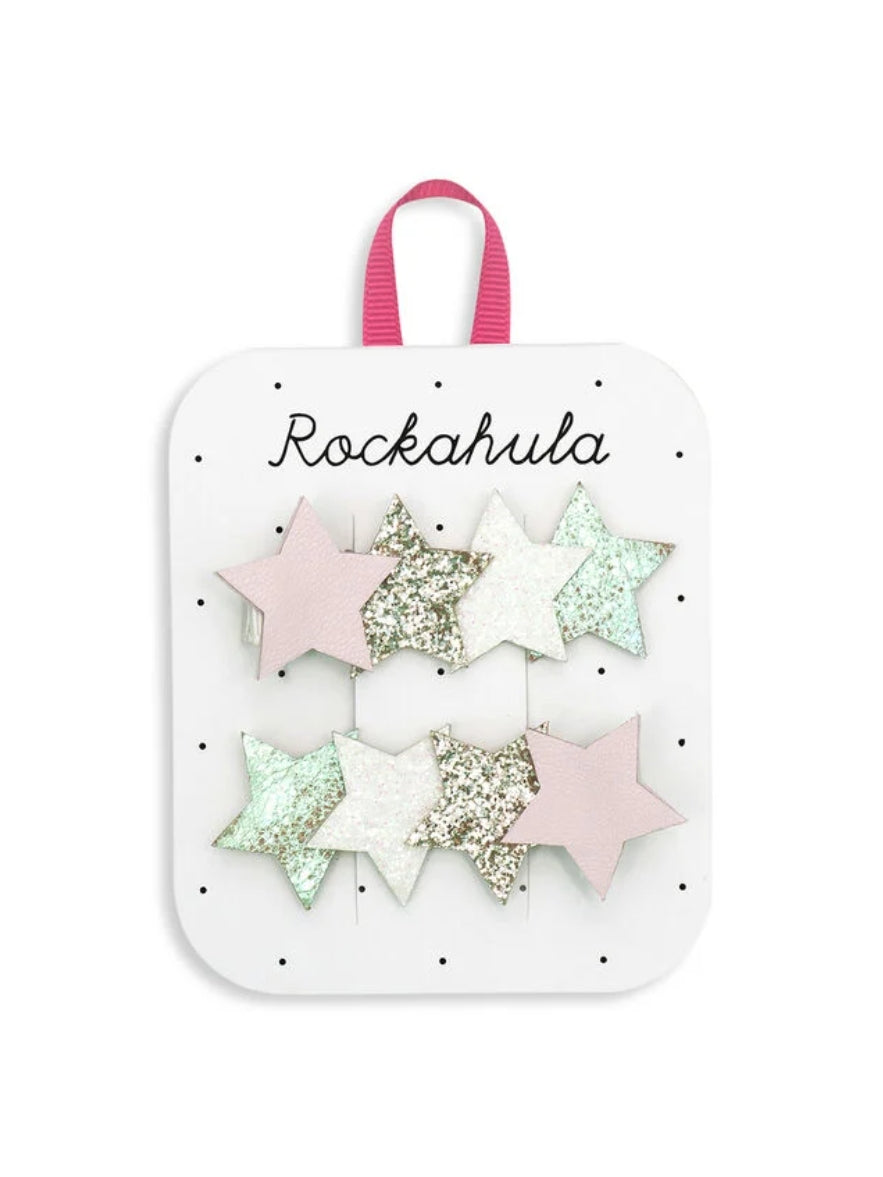 Precio unitario porTwo salon bar clips covered in grosgrain ribbon, adorned with a glistening row of pastel and iridescent coloured stars. Perfect for adding a touch of elegance and shimmer!