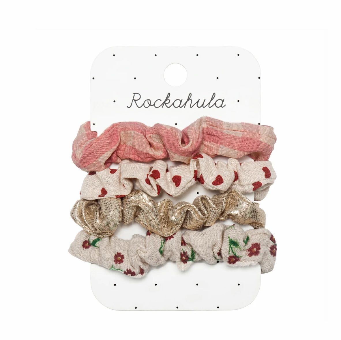 A pack of four sweet and wearable scrunchies, each in a different beautiful fabric. Featuring our gorgeous Taylor gingham print, a soft gold shimmer, love heart print and our sweet wildflower fabric - these are the perfect scrunchies for autumnal adventures.