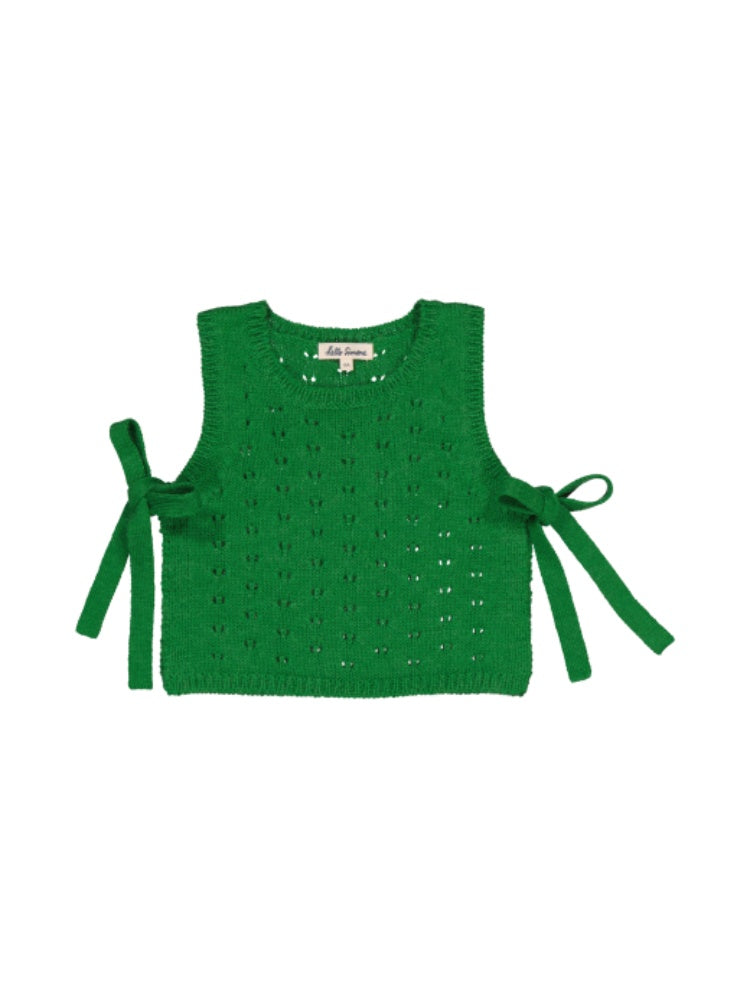 Perle is a pretty openwork tank top in cat's paw stitch knitted from very soft, warm Italian yarns and fastened with two side ties. This tank top will look great over a dress or one of our under-turtleneck.