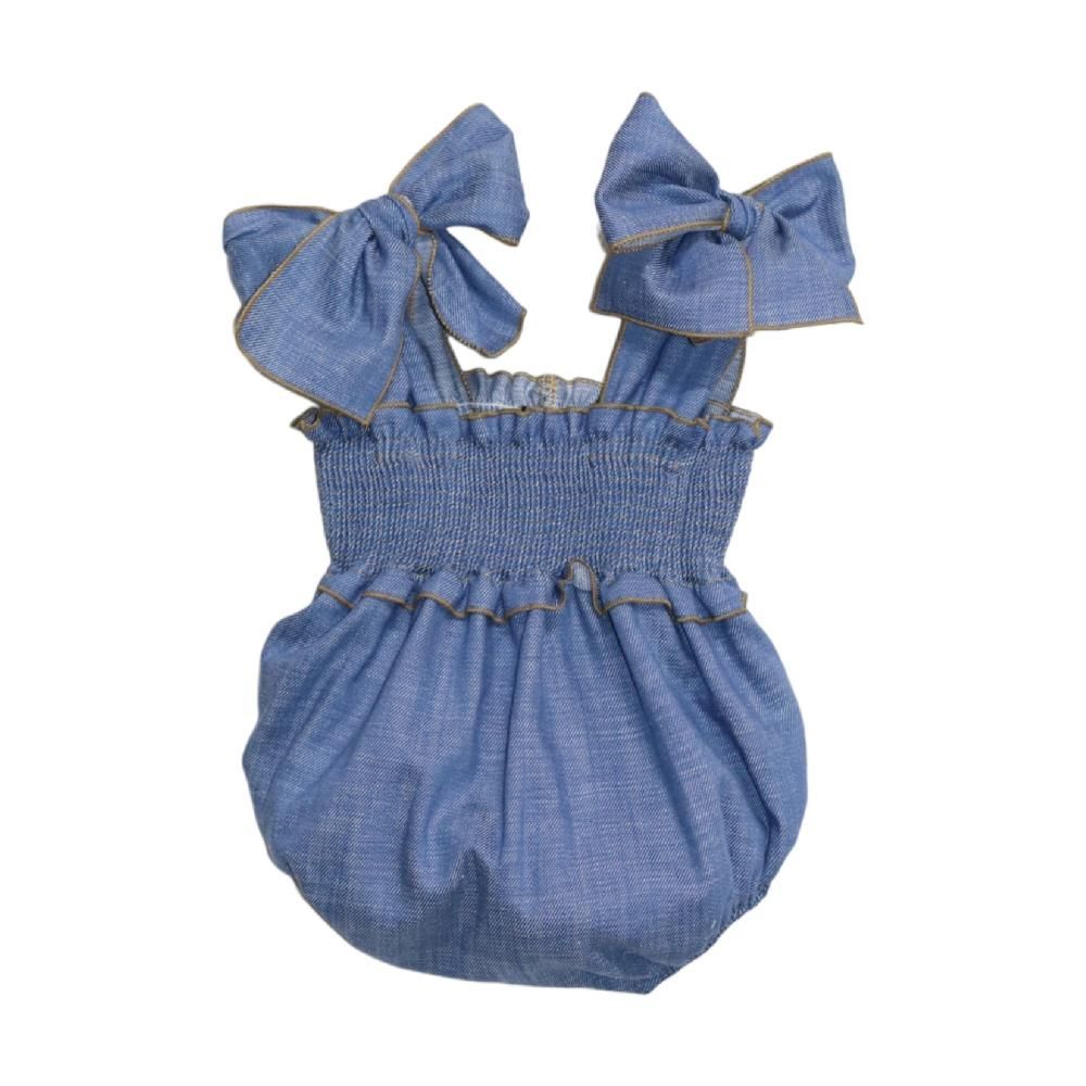 Give your baby girl a stylish yet comfortable look with this denim-inspired romper from Phiclothing. Made in Portugal, this romper features oversized bows on the straps and a smocked bodice for a chic, playful design. The lightweight fabric mimics denim but is soft and breathable, making it perfect for warm weather outings or casual days at home.