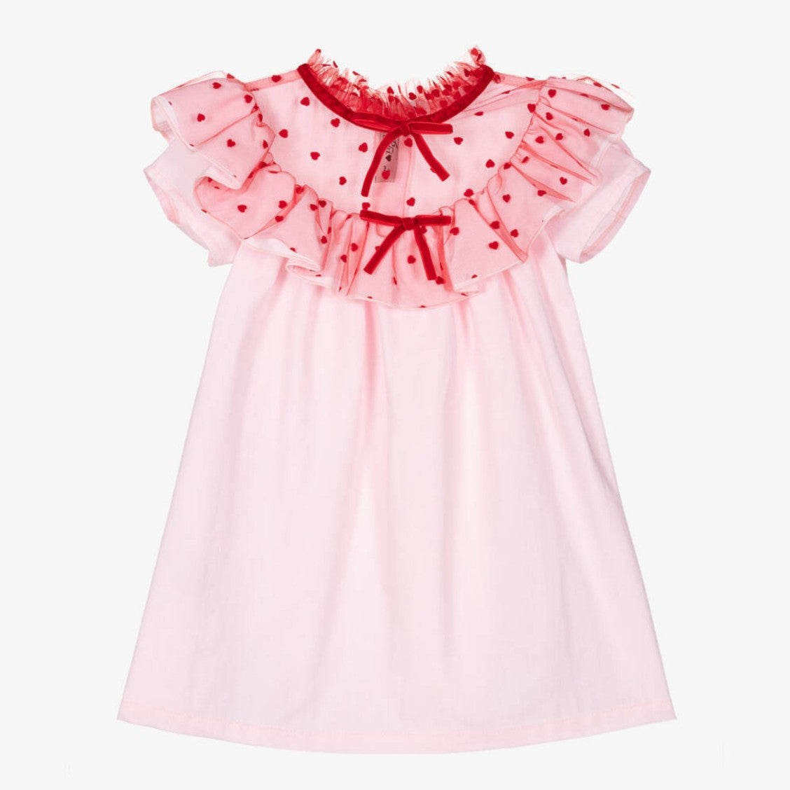• Design: Pink cotton dress with red tulle overlay featuring heart motifs and frilly ruffled details