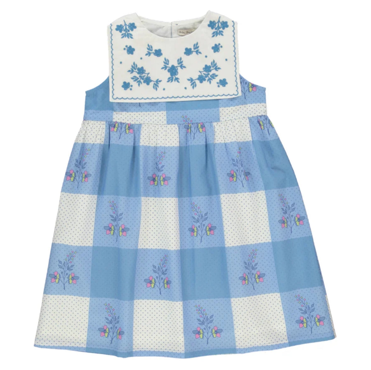The Elsa Dress is a timeless beauty, featuring a charming vintage-style patchwork print in soft blue and natural checks, adorned with delicate dots and florals. Its adorable square collar is enhanced with signature floral embroidery, adding a touch of elegance. Crafted from the softest 100% cotton for all-day comfort, this dress is finished with a back closure featuring mother-of-pearl buttons. A truly stunning piece for any special occasion or everyday charm.