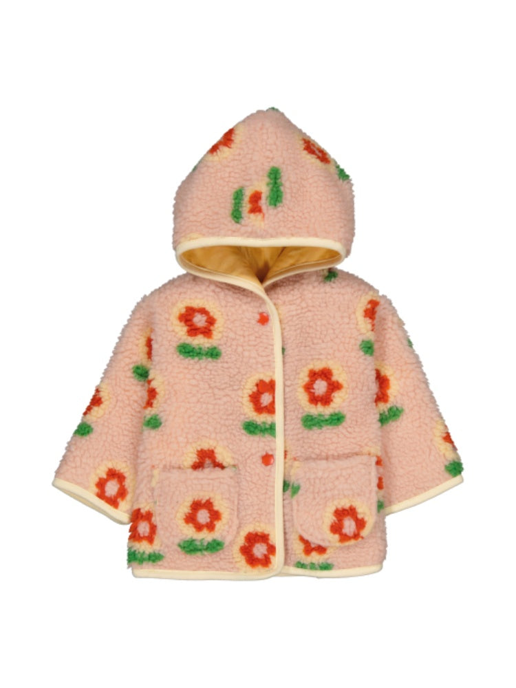 A soft baby coat in fleece with a hood to keep out the cold. We love Poppy with its charming floral print, contrasting bias and two patch pockets.