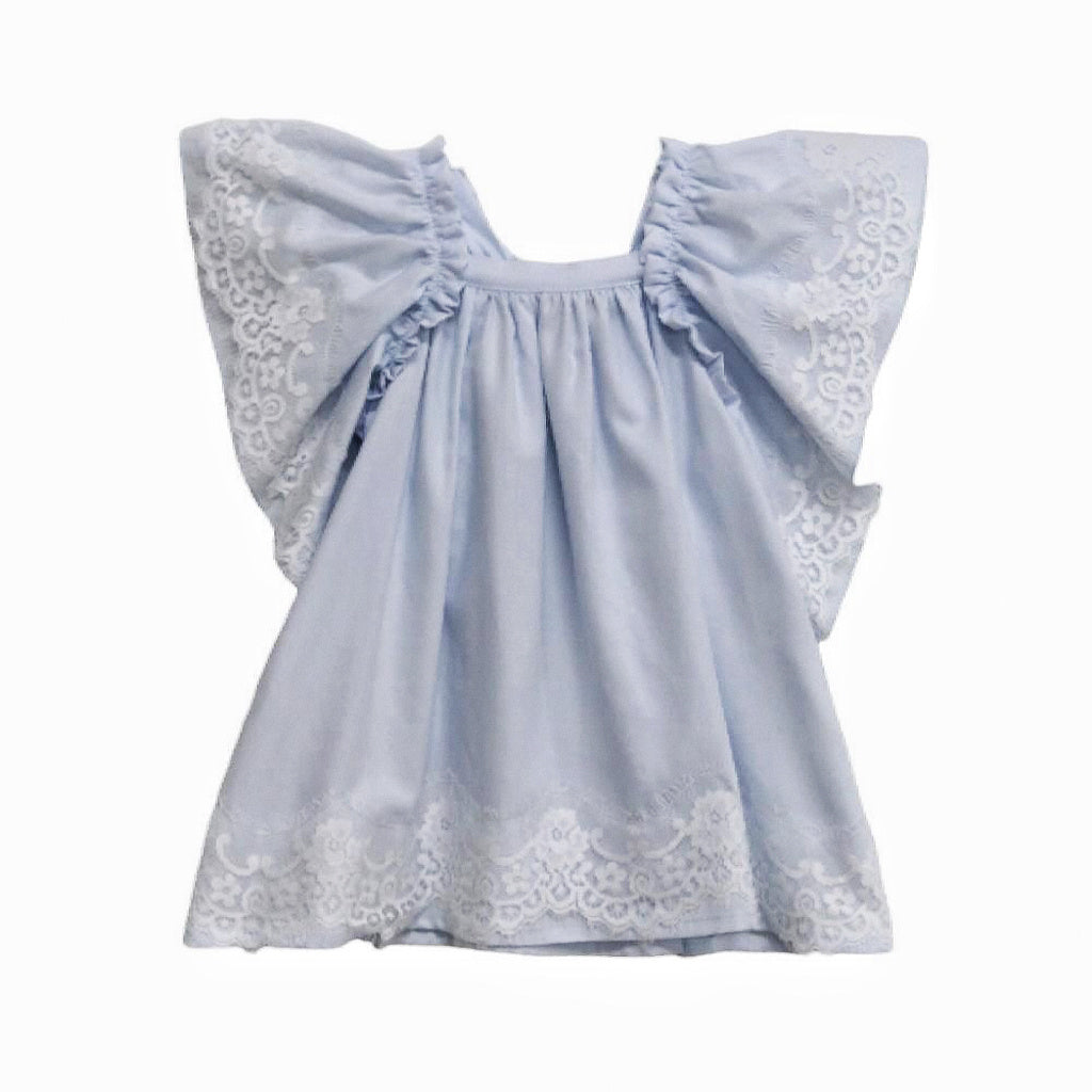 Girls Light Blue Lace-Trimmed Oxford Cotton Dress