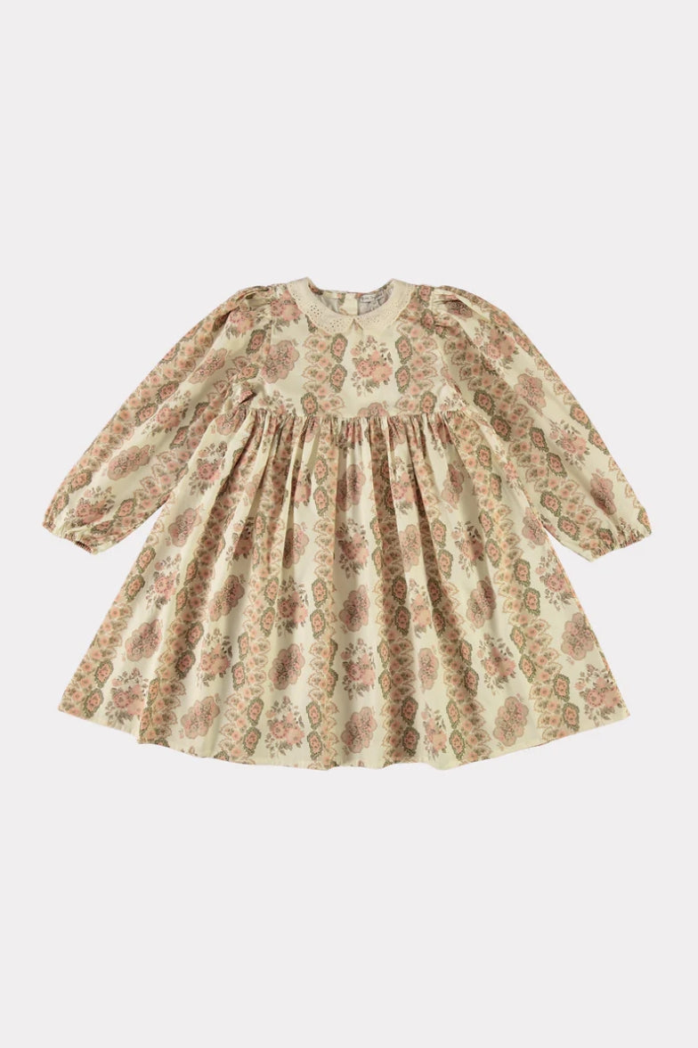 Ode to nostalgia of decades past. Our signature tapestry floral print Darja in most beautiful nostalgic hues of ecru, pink and green. Darja dress features sweetest antique white embroidered collar in cotton, elegant long puff sleeves and closes in the back with mother of pearl buttons. And of course flouncy skirting - perfect for twirling.